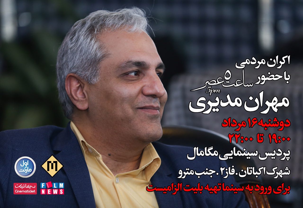 اكران مردمى ساعت پنج عصر با حضور #مهران_مديرى دوشنبه ١۶ مرداد براى سانس هاى ساعت ١٩:٠٠ تا ٢٢:٠٠ در پرديس سينمايى مگامال