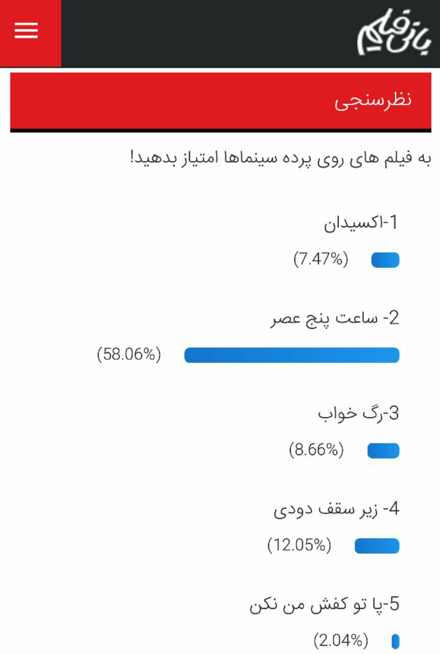 نظرخواهى جديد بانى فيلم؛ از كاربران محترم درخواست مى شود با مراجعه به سايت بانى فيلم در اینجا از ميان هفت فيلم روى پرده سينماها، به فيلم مورد علاقه خود امتياز دهند.