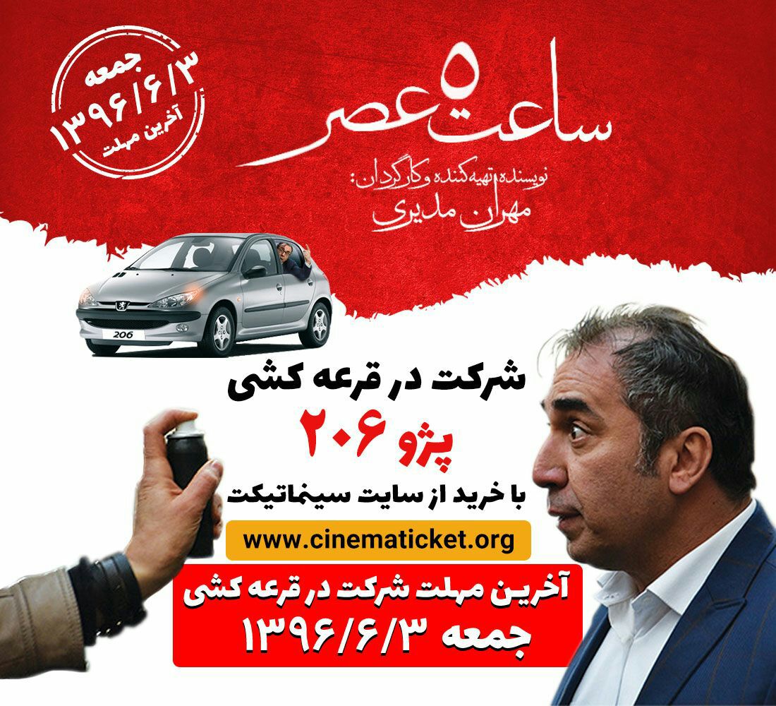 فقط تا روز جمعه سوم شهریور فرصت دارید تا با خرید بلیت فیلم "ساعت پنج عصر" ساخته مهران مدیری از سینماتیکت در قرعه کشی یک دستگاه پژو 206 شرکت کنید.